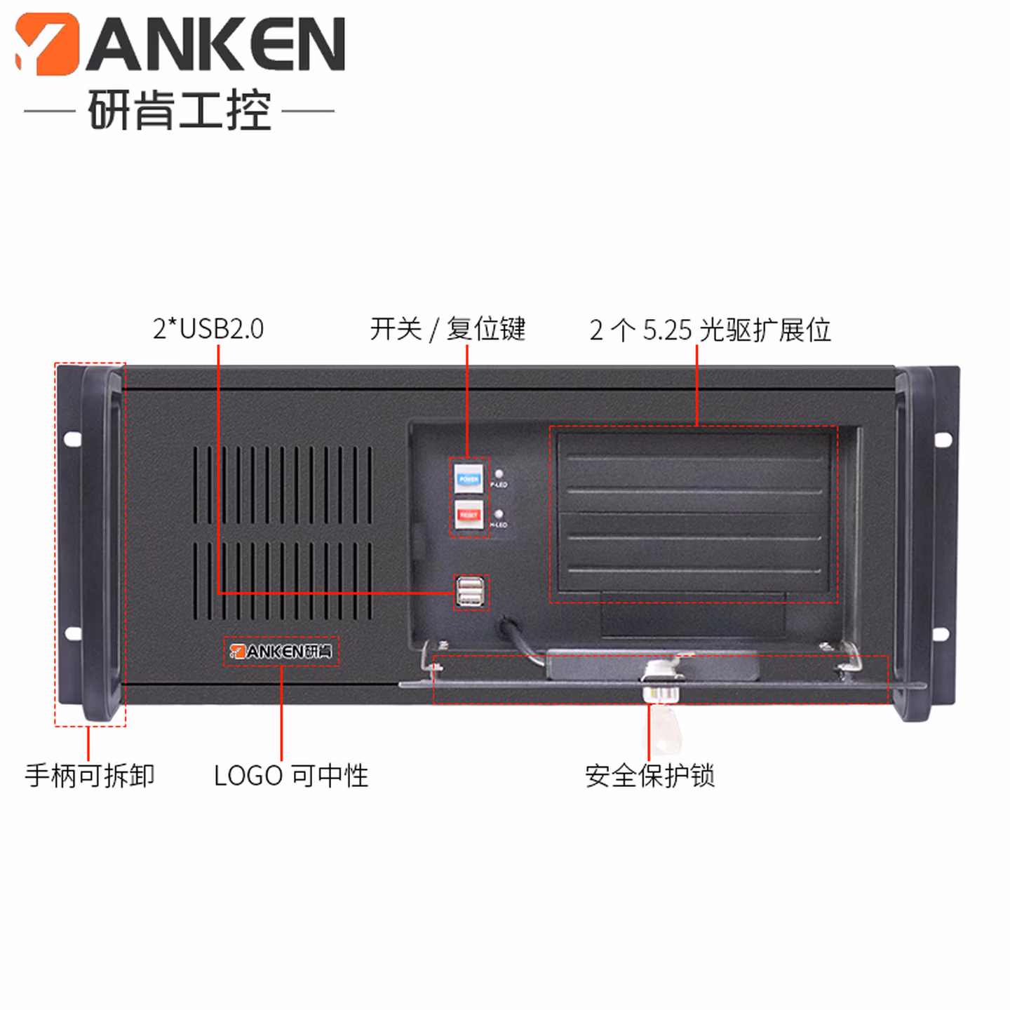 | 前置接口 | LOGO可中性出货,2*USB2.0,手柄可拆卸,2个5.25光驱扩展位,安全保护锁,重建键,开关键 |