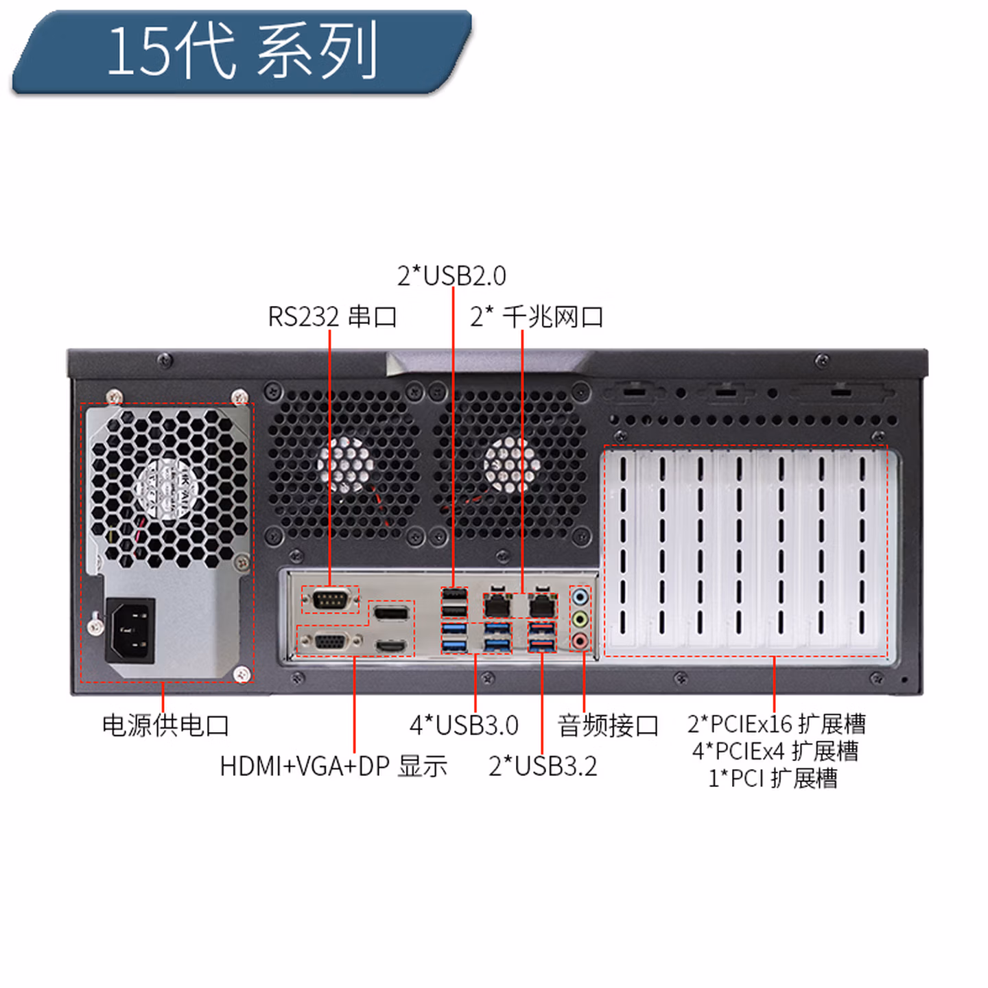 | 后置接口 | VGA+HDMI+DVI显示,音频接口,2*千兆网口,2*USB3.0,4*USB2.0,PS/2口,电源供电口七个全高直插扩展槽 | VGA+HDMI+DP显示,音频接口,2*千兆网口,6*USB3.0, 4*USB2.0PS/2口,电源供电口七个全高直插扩展槽 | VGA+HDMI+DP显示,音频接口,2*千兆网口,4*USB3.0, 4*USB2.02*USB3.2,电源供电口七个全高直插扩展槽 |