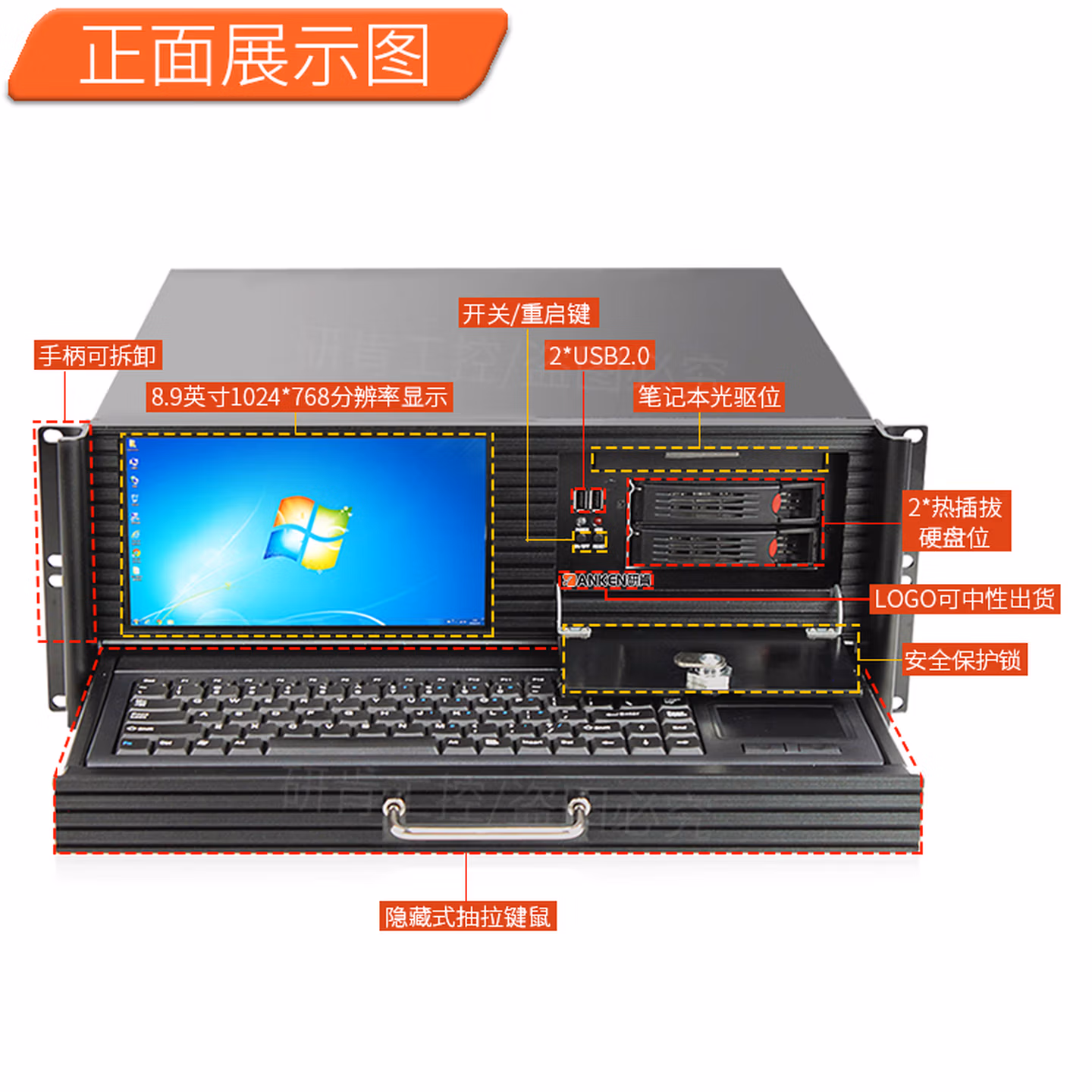 | 前置接口 | 开关键,LOGO可中性出货,8.9英寸1024*768显示屏,2*USB2.0,重启键,87键键盘,触控鼠标,2*热插拔硬盘位,笔记本光驱位,手柄可拆卸 |