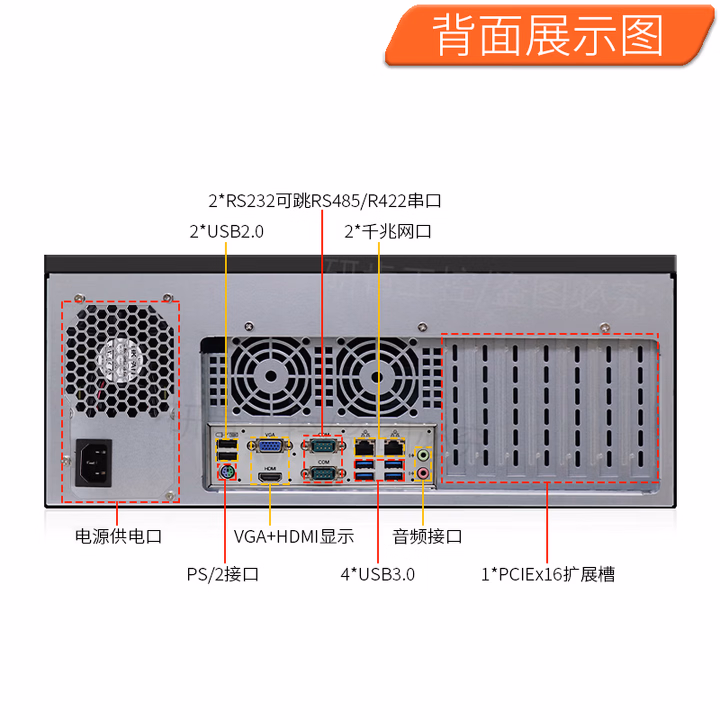 | 后置接口 | 2*千兆网口,2*USB2.0接口,4*USB3.0接口,2*COM口,音频接口,1*PCIEx16扩展槽,电源供电口(可定制内置电池) |