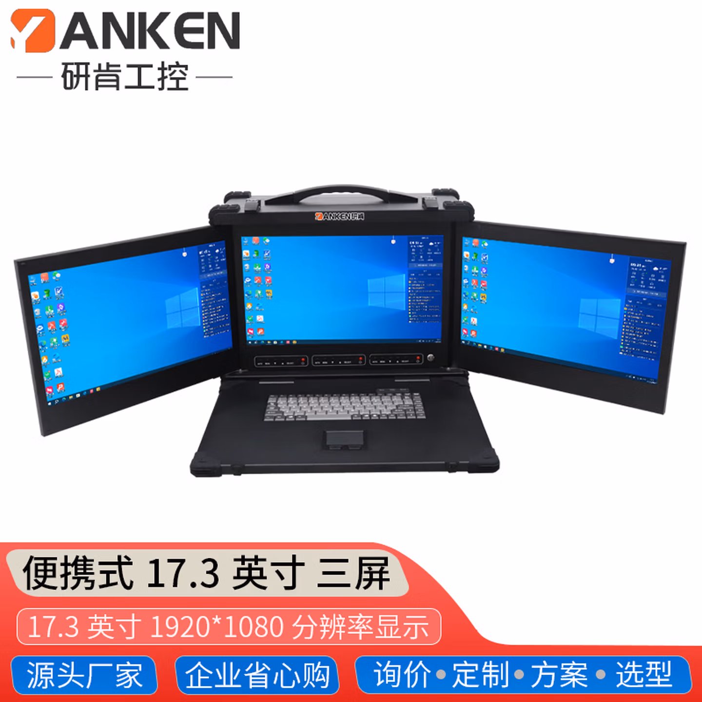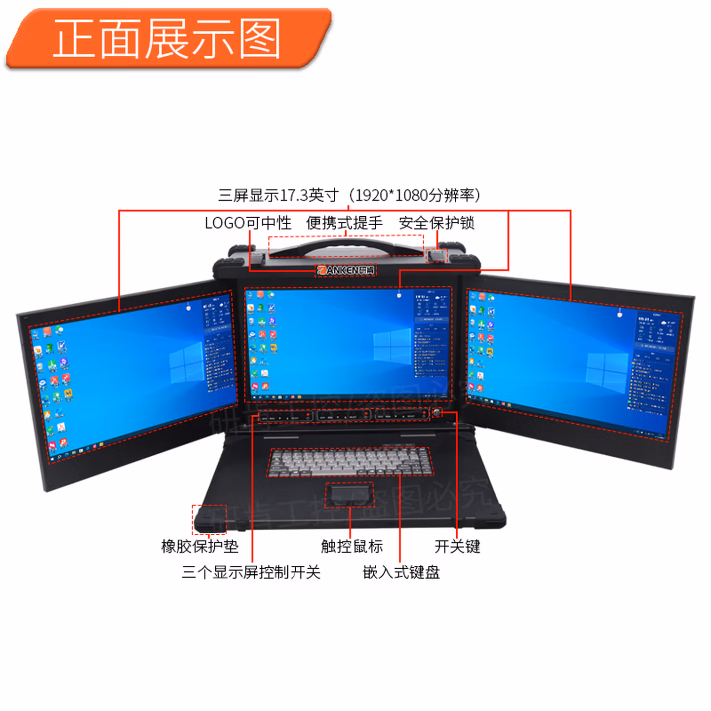 | 前置接口 | 开关键,LOG0可中性出货,3*17.3英寸显示屏,便携式提手,触控鼠标,嵌入式键盘,安全卡扣 | ||