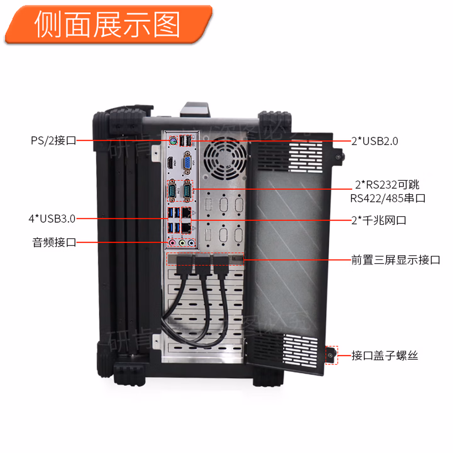| 后置接口 | 2*千兆网口,2*USB2.0接口,4*USB3.0接口,前置三屏17.3英寸显示接口2*COM口,音频接口,电源供电口(可定制内置电池) | ||