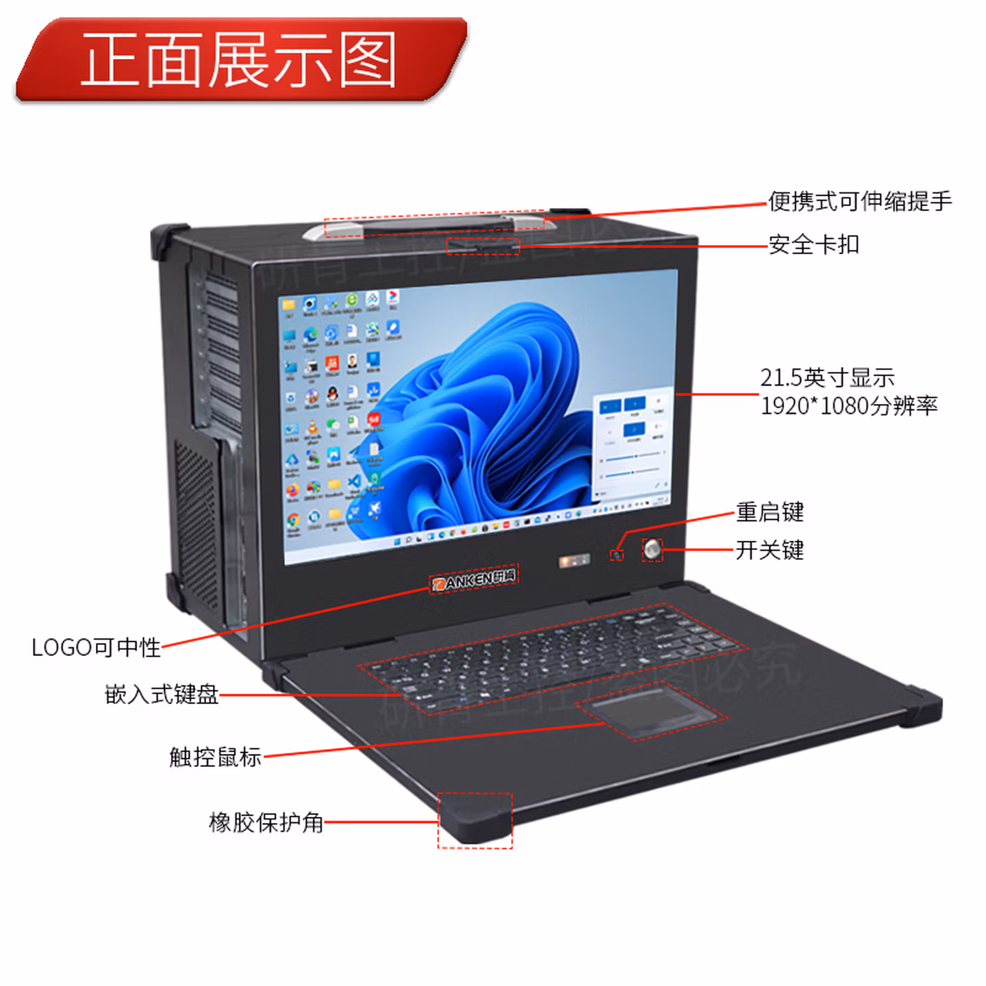 | 前置接口 | 开关键,LOG0可中性出货,21.5英寸显示屏,便携式提手,触控鼠标,嵌入式键盘,安全卡扣,2*USB2.0 | ||