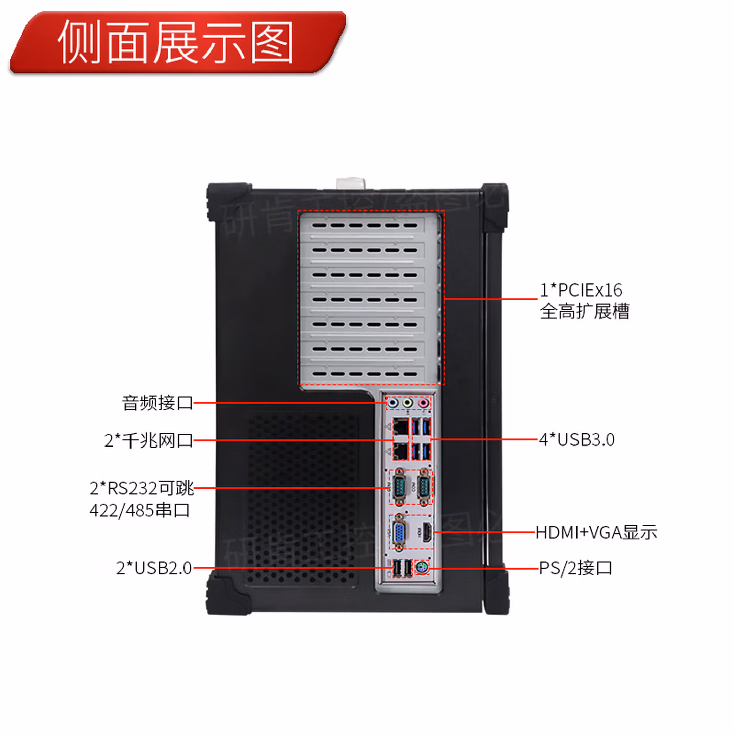 | 后置接口 | 2*千兆网口,2*USB2.0接口,4*USB3.0接口,VGA+HDMI显示接口,2*COM口,1个全高扩展槽,音频接口,电源供电口(可定制内置电池) | ||
