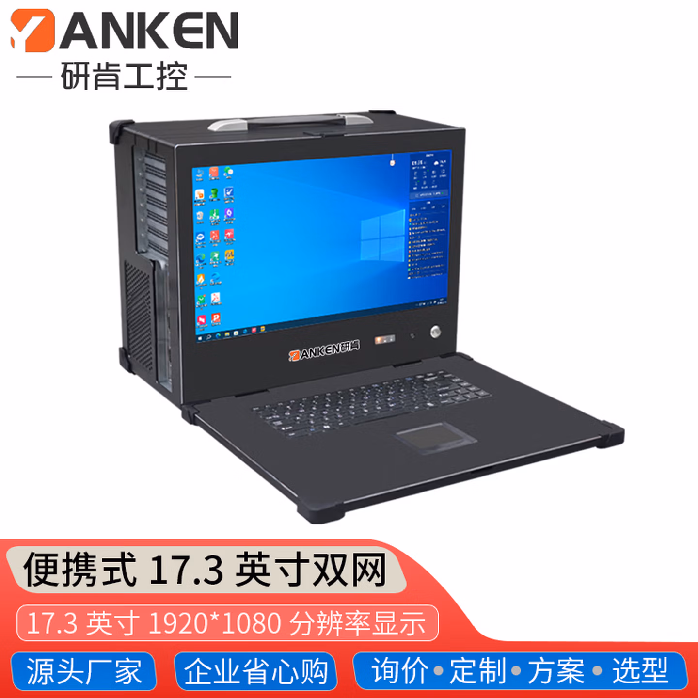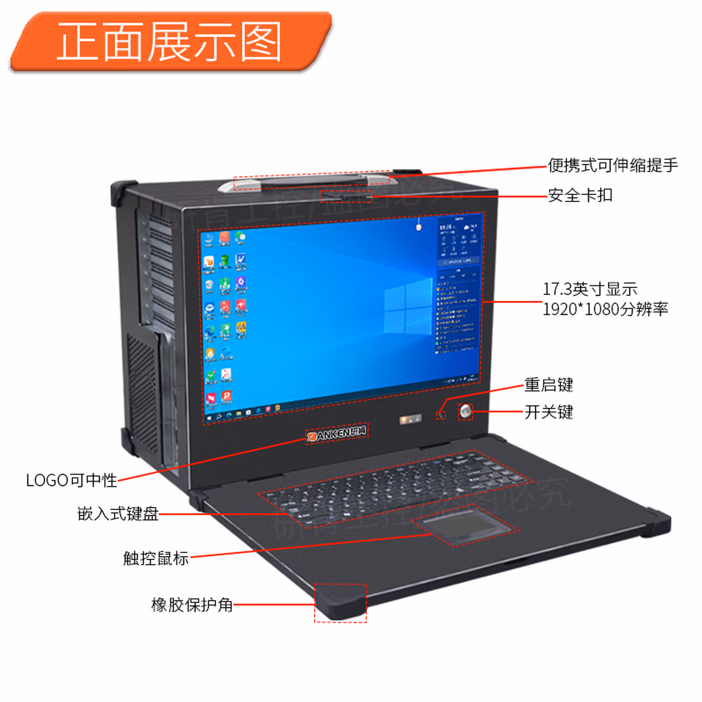 | 前置接口 | 开关键,LOG0可中性出货,17.3英寸显示屏,便携式提手,触控鼠标,嵌入式键盘,安全卡扣,2*USB2.0 | ||