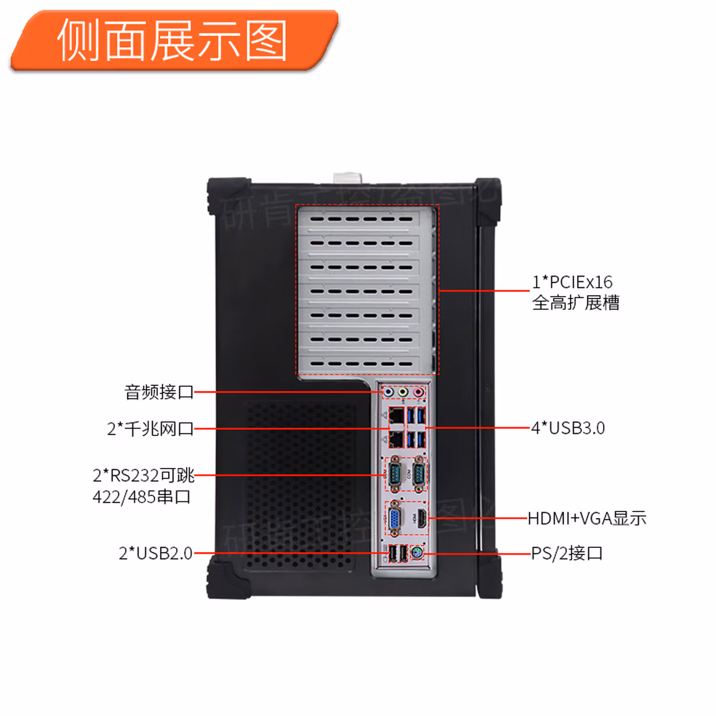 | 后置接口 | 2*千兆网口,2*USB2.0接口,4*USB3.0接口,VGA+HDMI 显示接口,2*COM口,1个全高扩展槽,音频接口,电源供电口(可定制内置电池) | ||
