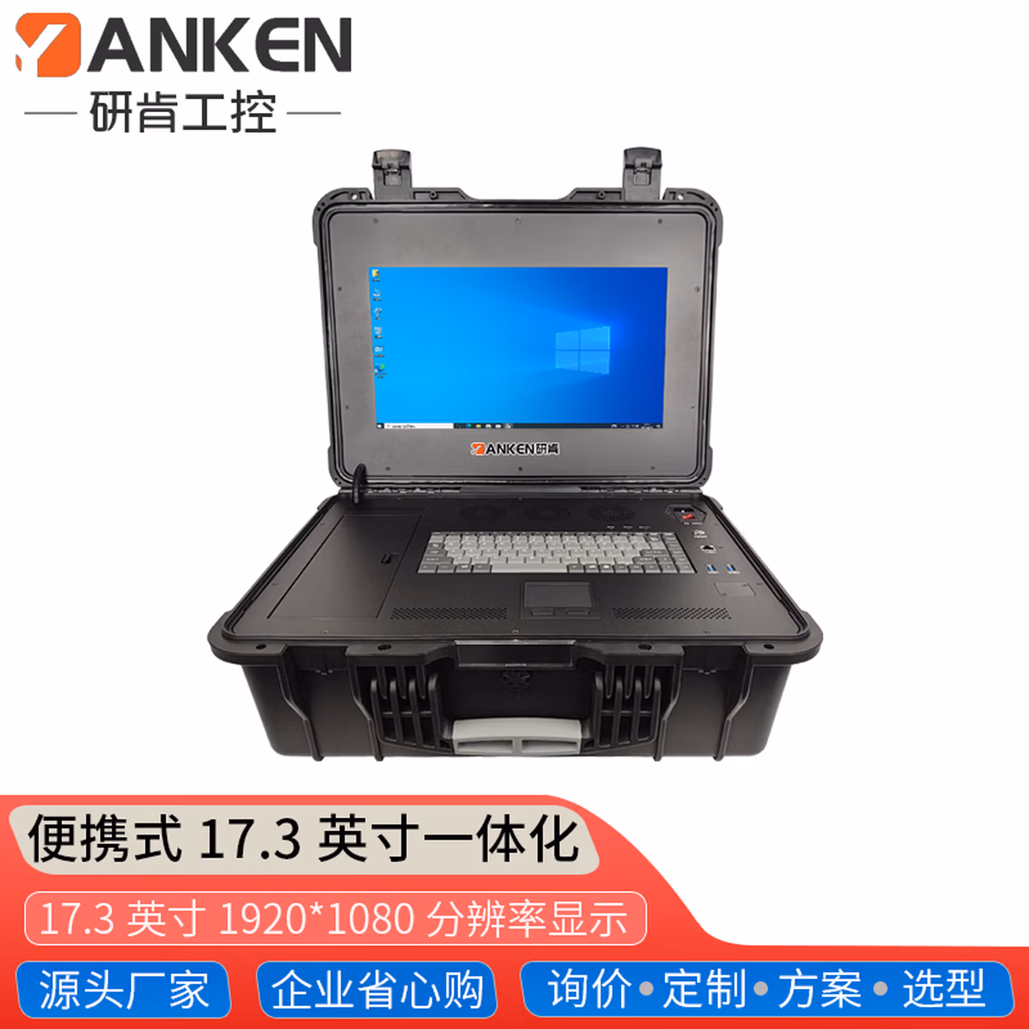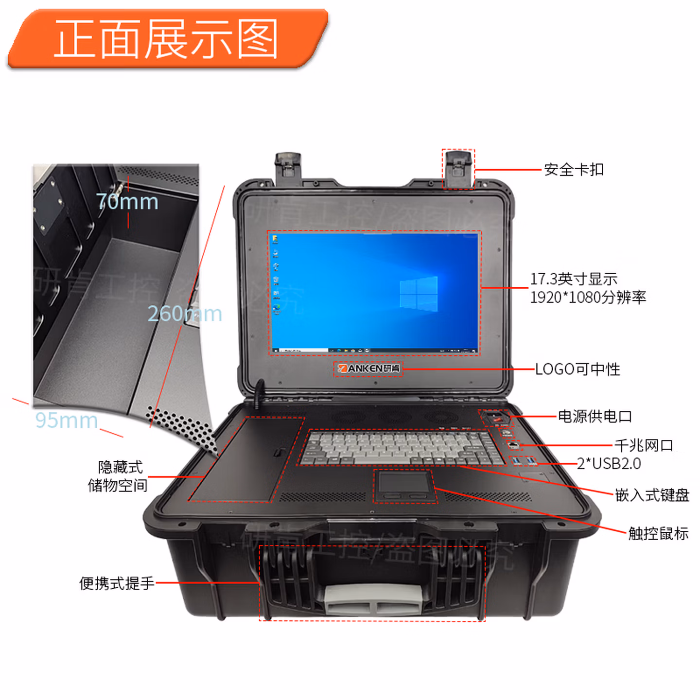 | 前置接口 | 开关键,LOG0可中性出货,17.3英寸显示屏,便携式提手,触控鼠标,嵌入式键盘,安全卡扣,2*USB2.0,千兆网口,隐藏式储物空间,电源供电口(可定制内置电池) | ||