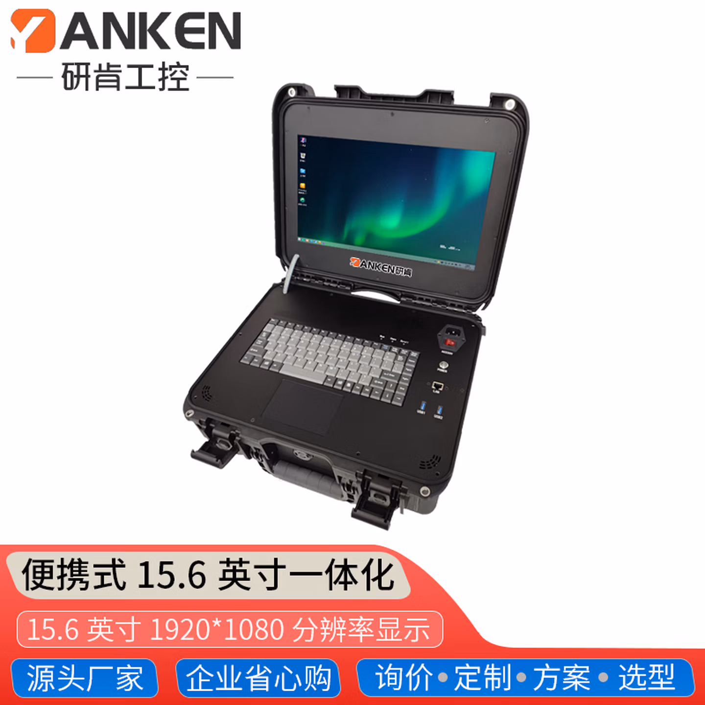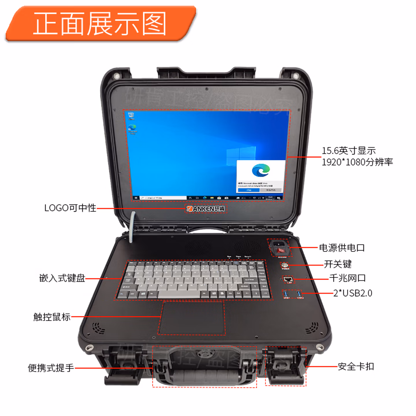 | 前置接口 | 开关键,LOG0可中性出货,15.6英寸显示屏,便携式提手,触控鼠标,嵌入式键盘,安全卡扣,2*USB2.0,千兆网口,电源供电口(可定制内置电池) | ||
