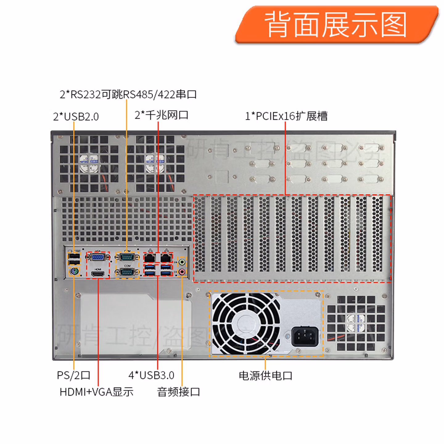 | 后置接口 | 2*千兆网口,2*USB2.0接口,4*USB3.0接口,2*COM口,音频接口,1*PCIEx16扩展槽,电源供电口(可定制内置电池) |