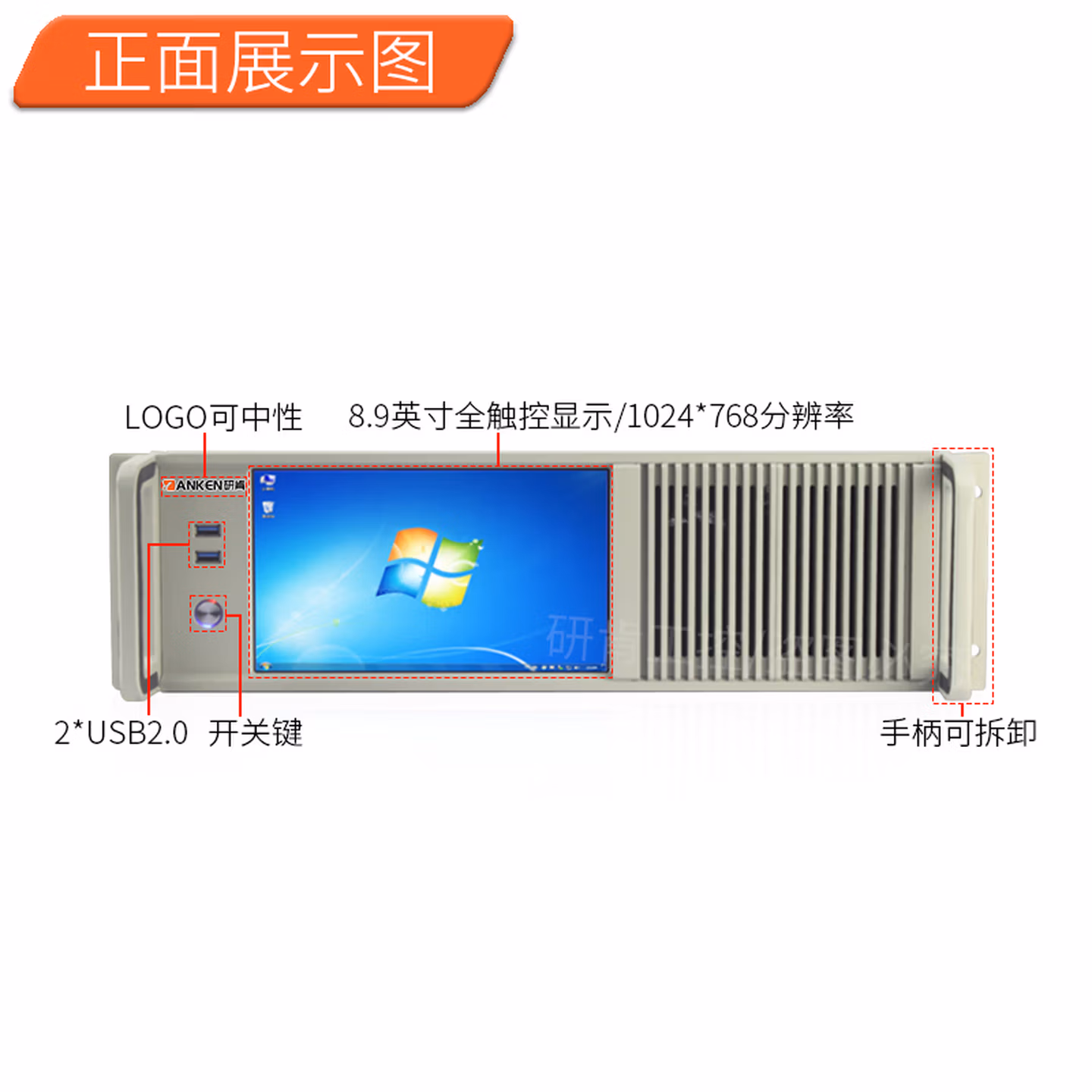 | 前置接口 | 开关键,LOG0可中性出货,8.9英寸1024*768触控屏,2*USB2.0,手柄可拆卸 | ||