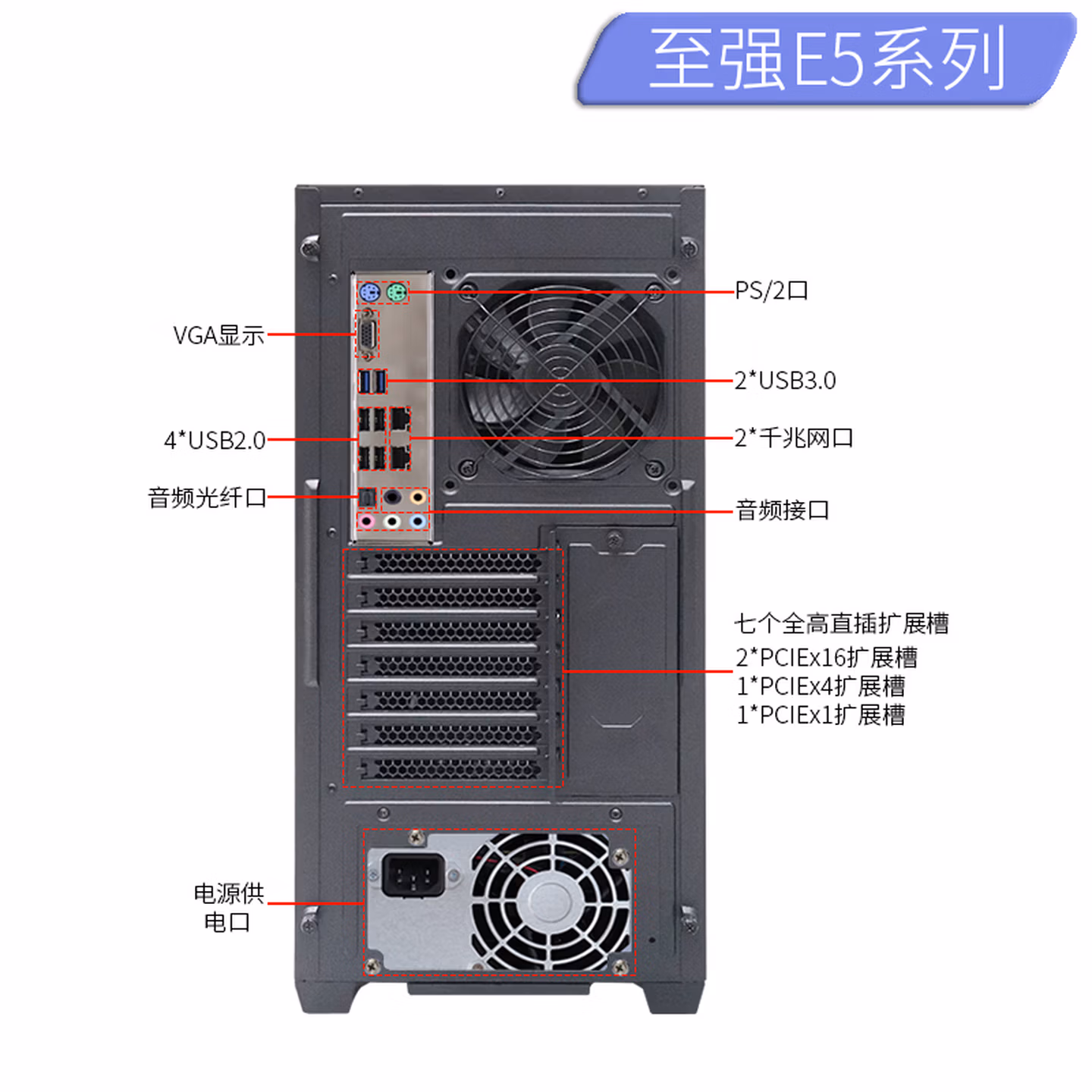 | 后置接口 | VGA显示,1*RS232串口,2*USB3.0,4*USB2.0,2*千兆网口电源供电口,音频光纤口,音频接口,七个全高扩展槽 | VGA显示,4*USB2.0,4*USB3.02*千兆网口,电源供电口,IPMI远程管理端口,音频接口七个全高扩展槽 | VGA显示,1*RS232串口2*USB2.0,4*USB3.0,2*千兆网口,电源供电口,音频光纤口,七个全高扩展槽 |