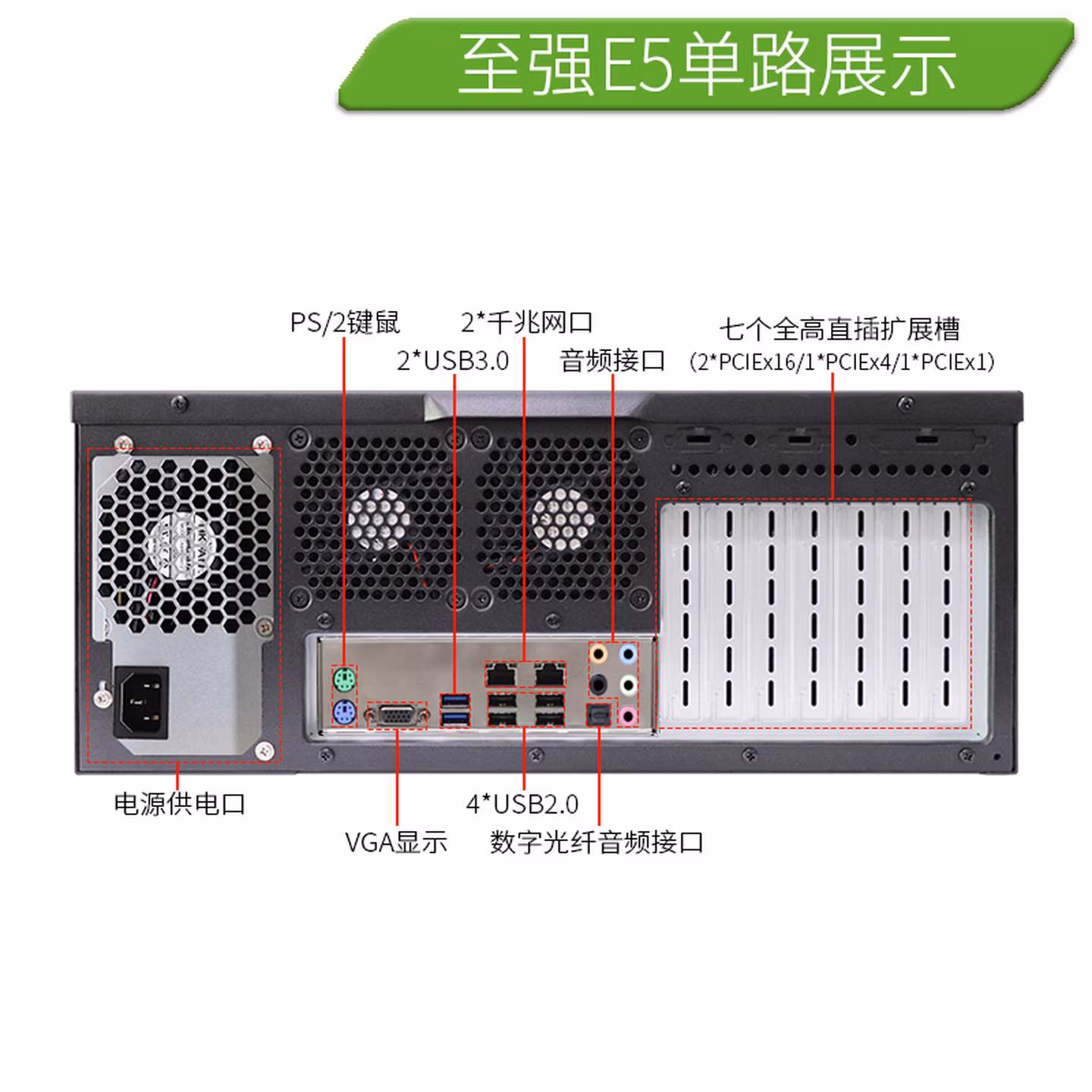 | 后置接口 | VGA显示,PS/2口,2*USB3.0, 4*USB2.0,音频接口,音频光纤接口,电源供电口,2*千兆网口七个全高直插扩展槽 | VGA显示,2*USB2.0,4*USB3.2,IPMI远程管理,2*2.5G网口,电源供电口,音频接口,七个全高直插扩展槽 | 电源供电口,RS232串口,2*USB2.0, 2*USB3.0,IPMI远程管理,音频接口,2*千兆网口,VGA显示,七个全高直插扩展槽 |