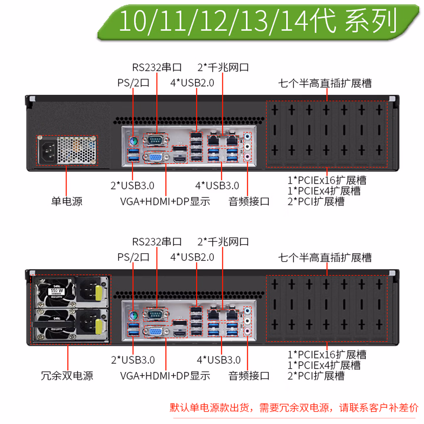 | 后置接口 | 4*USB2.0,VGA+HDMI+DVI 显示,音频接口,2*千兆网口,2*USB3.0,PS/2口,七个半高直插扩展槽,电源供电口(可定制冗余双电源) | VGA+HDMI+DP显示,音频接口,PS/2口,4*USB2.0,2*千兆网口,6*USB3.0,七个半高直插扩展槽,电源供电口(可定制冗余双电源) |