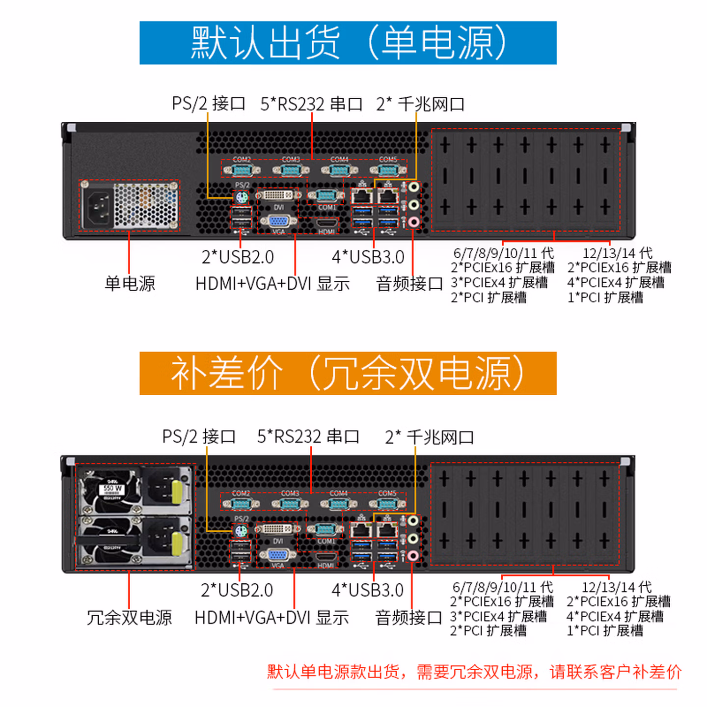 | 后置接口 | 2*千兆网口,2*USB2.0口,4*USB3.0口,5*RS232串口,音频接口,PS/2口,七个半高扩展槽,单电源(可定制冗余双电源) | |