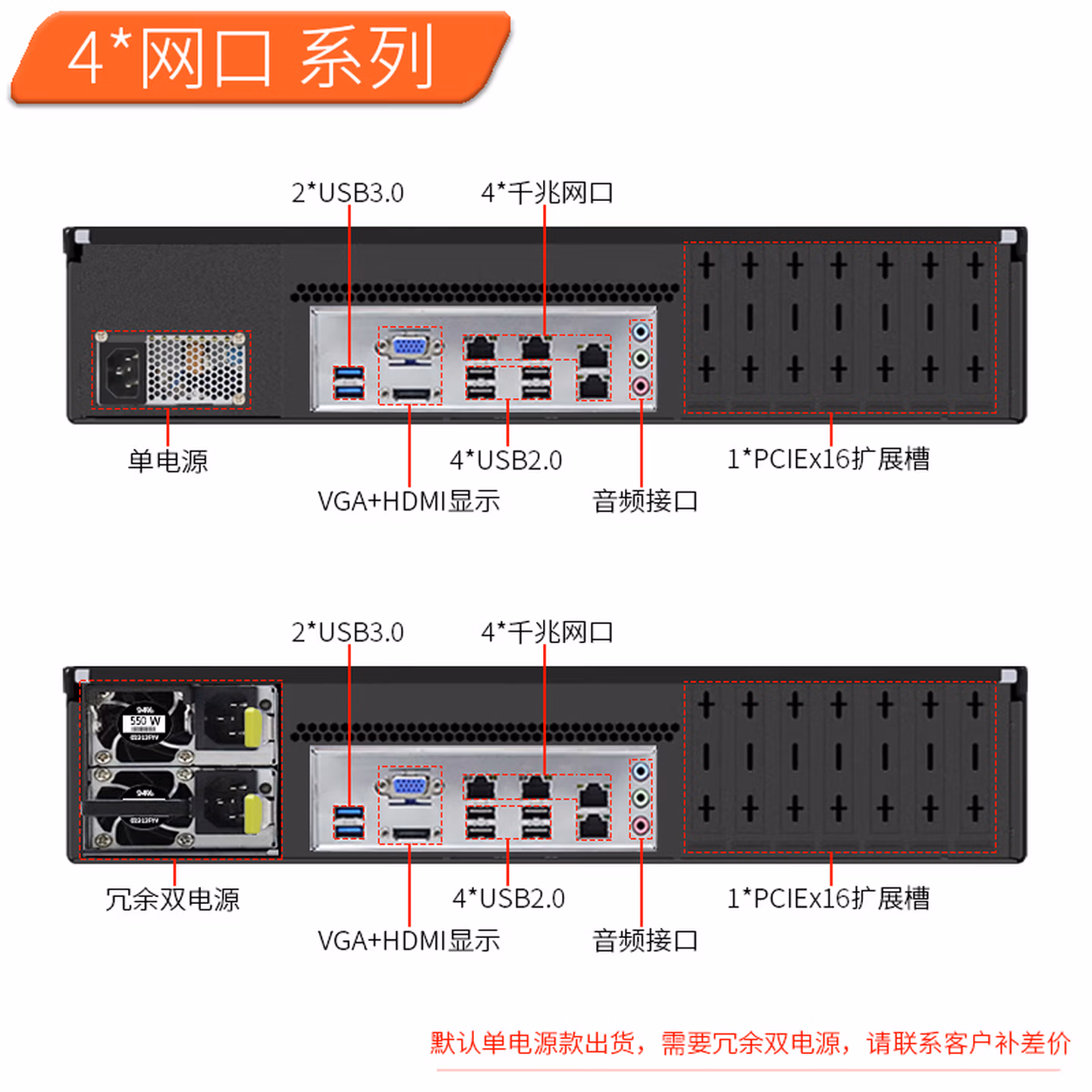 | 后置接口 | 2*USB3.0,VGA+HDMI显示,音频接口,4*千兆网口,4*USB2.0,1*PCIEx16扩展槽,电源供电口(可定制冗余双电源) | VGA+HDMI显示,音频接口,2*USB2.0,6*千兆网口,6*USB3.0,1*PCIEx16扩展槽,电源供电口(可定制冗余双电源) |