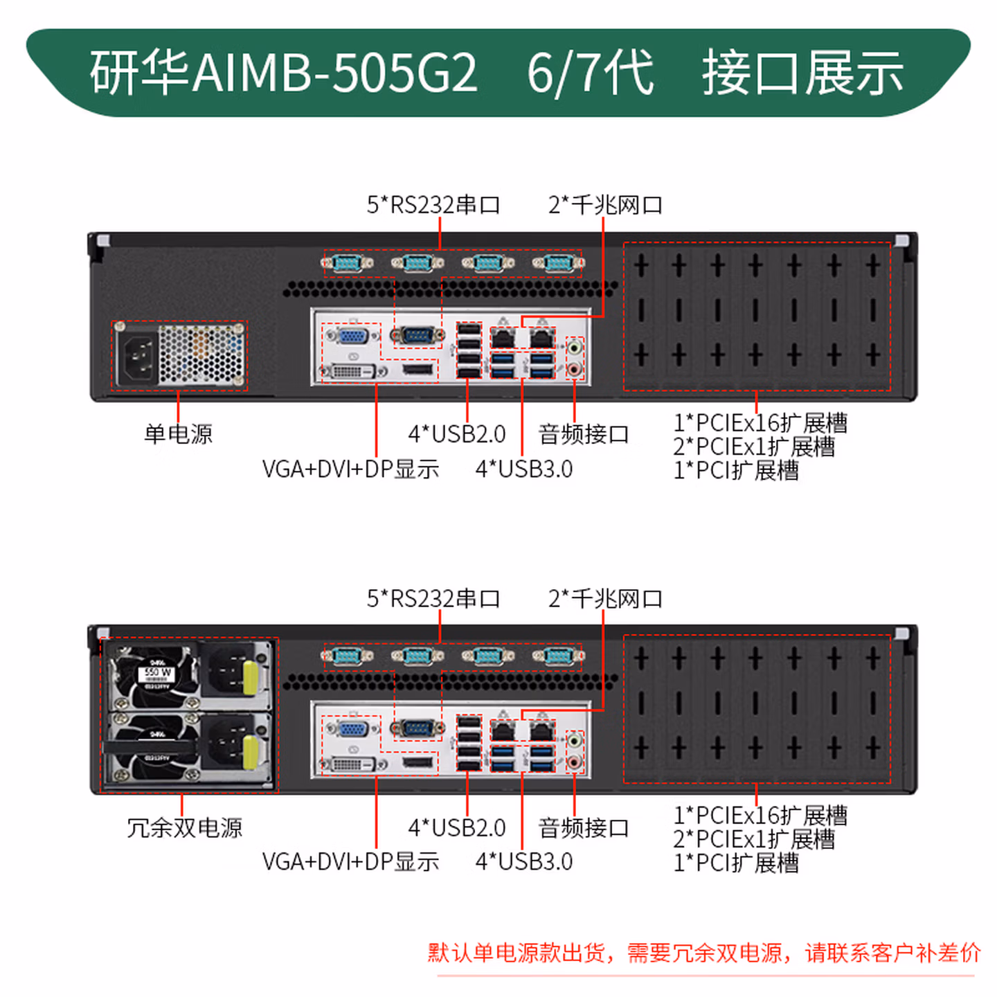 | 后置接口 | VGA+DVI+DP显示,5*RS232 串口, 4*USB2.0 ,4*USB3.0,2* 千兆网口,音频接口,电源供电口,七个半高扩展槽 | VGA+DVI+DP显示,4*RS232 串口,4*USB2.0,8*USB3.0,2* 千兆网口,音频接口,电源供电口,七个半高扩展槽 | VGA+HDMI+DP显示,5*RS232 串口, 4*USB2.0,4*USB3.0,2* 千兆网口,音频接口,电源供电口,七个半高扩展槽 |