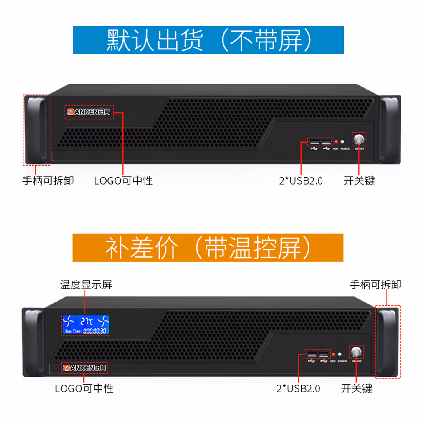 | 前置接口 | 开关键,LOGO可中性出货,2*USB2.0,手柄可拆卸,可定制温度显示屏 | |