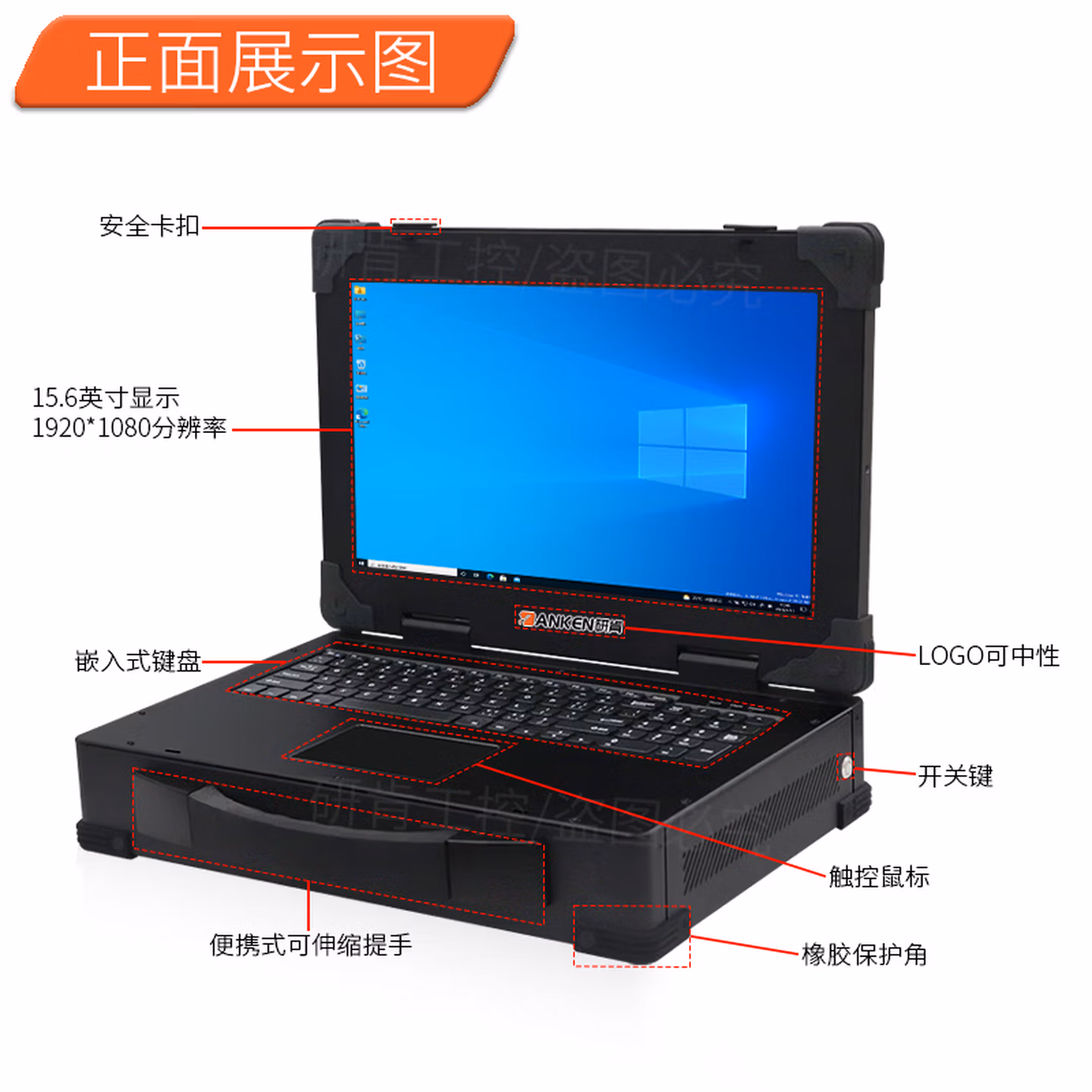 | 前置接口 | 开关键,LOG0可中性出货,15.6英寸显示屏,便携式提手,触控鼠标,嵌入式键盘,安全卡扣 |