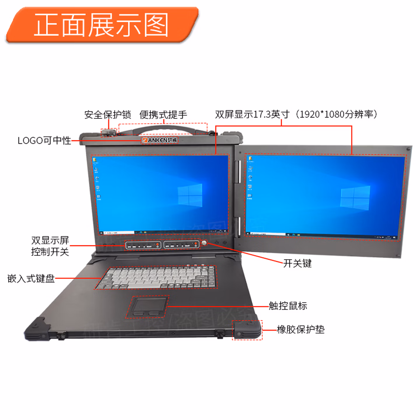 | 前置接口 | 开关键,L0G0可中性出货,2*17.3英寸显示屏,便携式提手,触控鼠标,嵌入式键盘,安全保护锁,橡胶保护垫 | ||