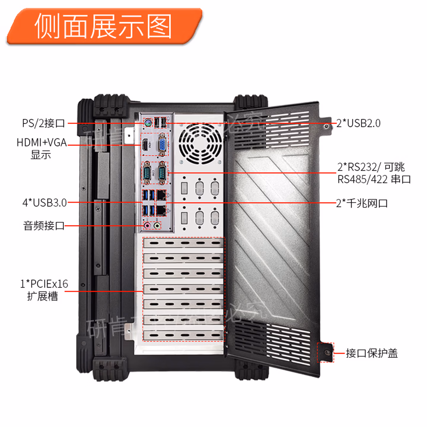 | 后置接口 | 2*千兆网口,2*USB2.0接口,4*USB3.0接口,前置双屏17.3英寸显示接口2*COM口,音频接口,电源供电口(可定制内置电池) | ||